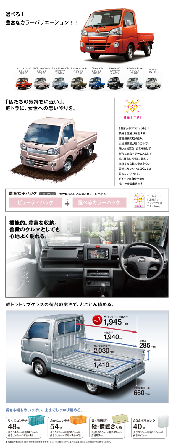 仕事だけでなく、働く人の毎日の生活にも笑顔を広げる、「もっと愛せる軽トラ」を目指しています。